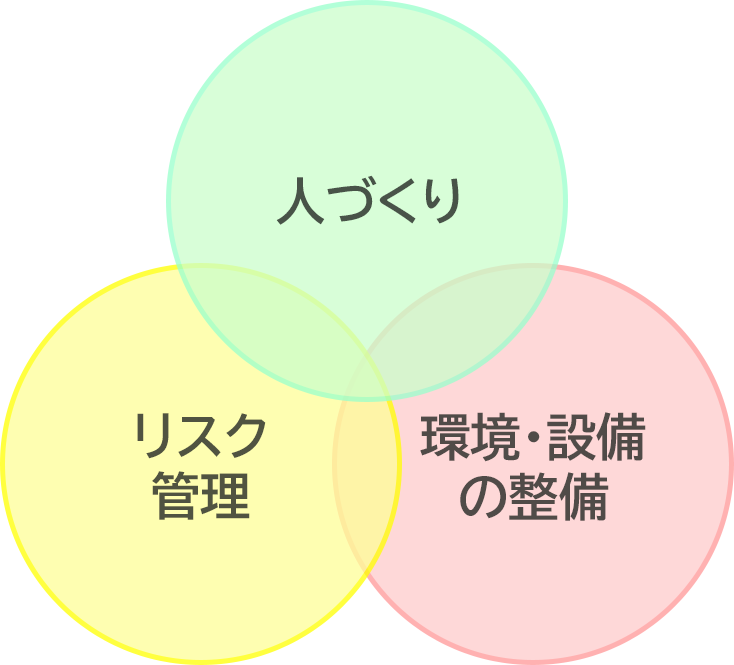 「人づくり」・「リスク管理」・「環境・設備の整備」この3本柱で、目標達成を目指します。
