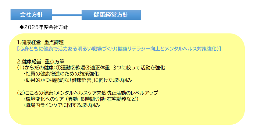 健康に対する取り組みを見える化し、企画から評価が一体となった実施により、社員への実効性の高い健康経営を目指します。