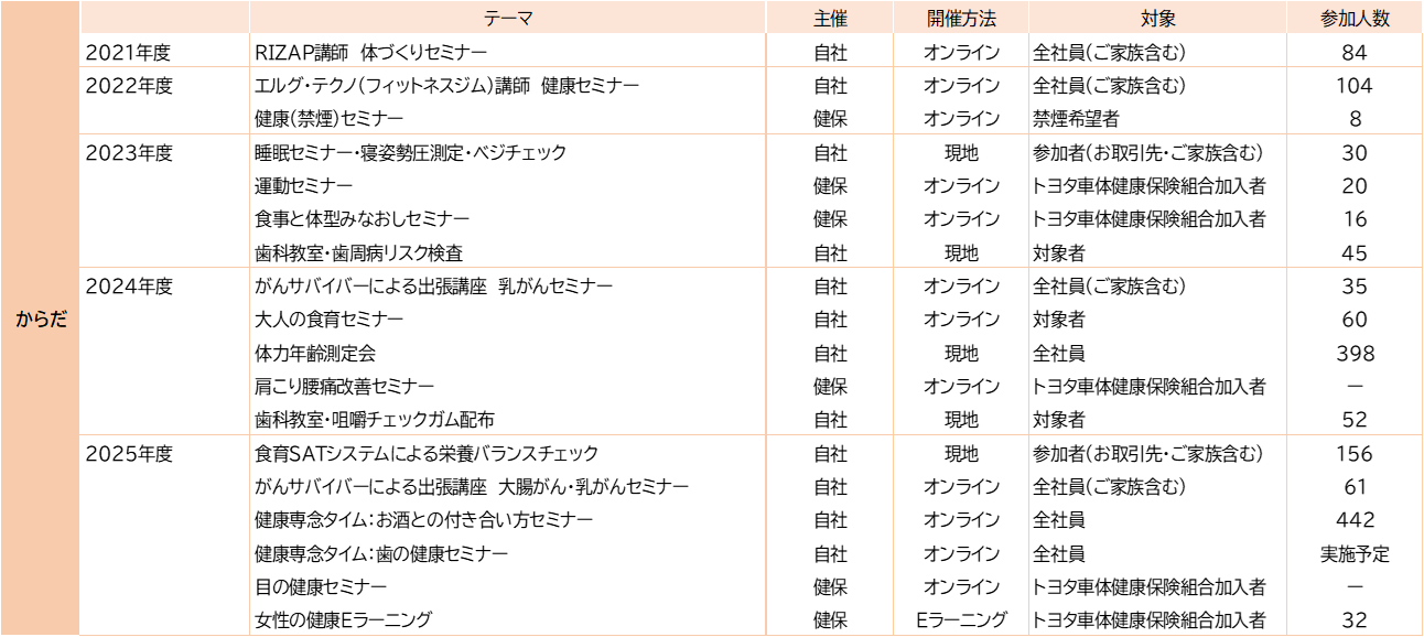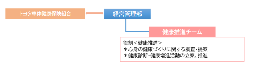 当社が加入しているトヨタ車体健康保険組合とも常に連携をしています。健康ポータルサイト(PepUp)を利用した、健康イベント(ウォーキングラリーやオンラインセミナー)もあり、従業員そして、ご家族も一緒に健康意識を向上させています。また、毎年実施されるトップ訪問では、健康保険組合と会社の健康課題の共有し施策検討を行っています。