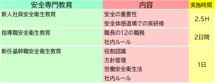 新入社員から管理職まで、階層別に受講する安全衛生教育を定め、実施しています。
