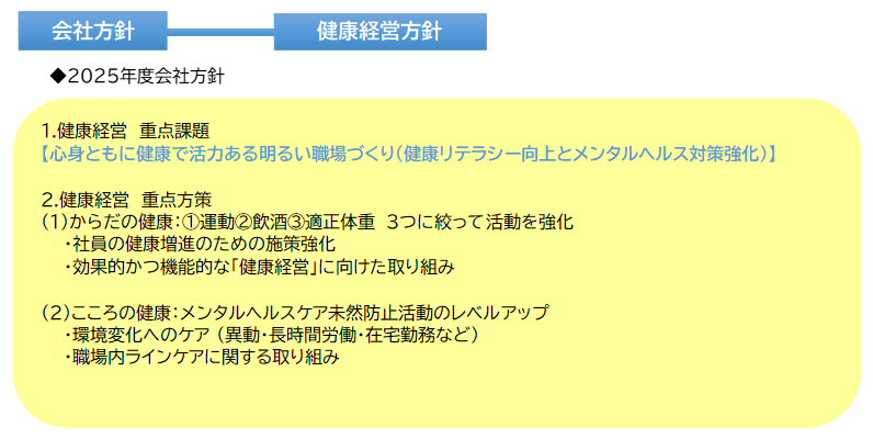 健康に対する取り組みを見える化し、企画から評価が一体となった実施により、社員への実効性の高い健康経営を目指します。