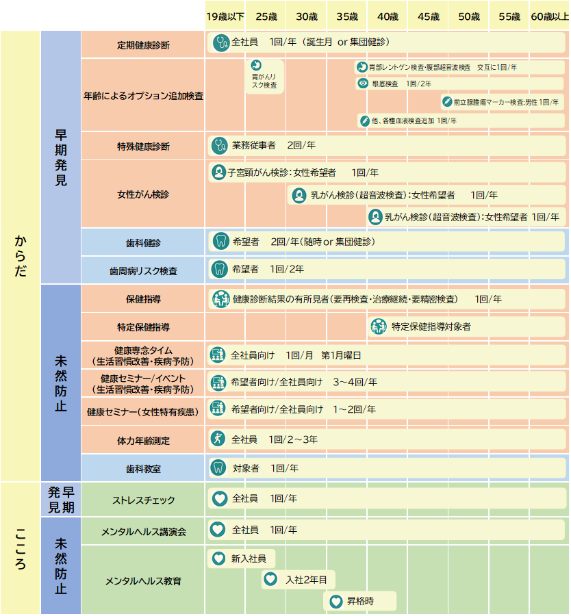 がんの早期発見・治療による効果は本人やご家族だけでなく、会社にとっても重要な健康への取り組みとなります。各種がん検診を自己負担なしで社内健診として実施しています。2020年度からは、胃がんリスク検査の対象年齢を39歳から25歳に引き下げ、よりがんの早期発見と適切な治療を実施できるように推進しています。
