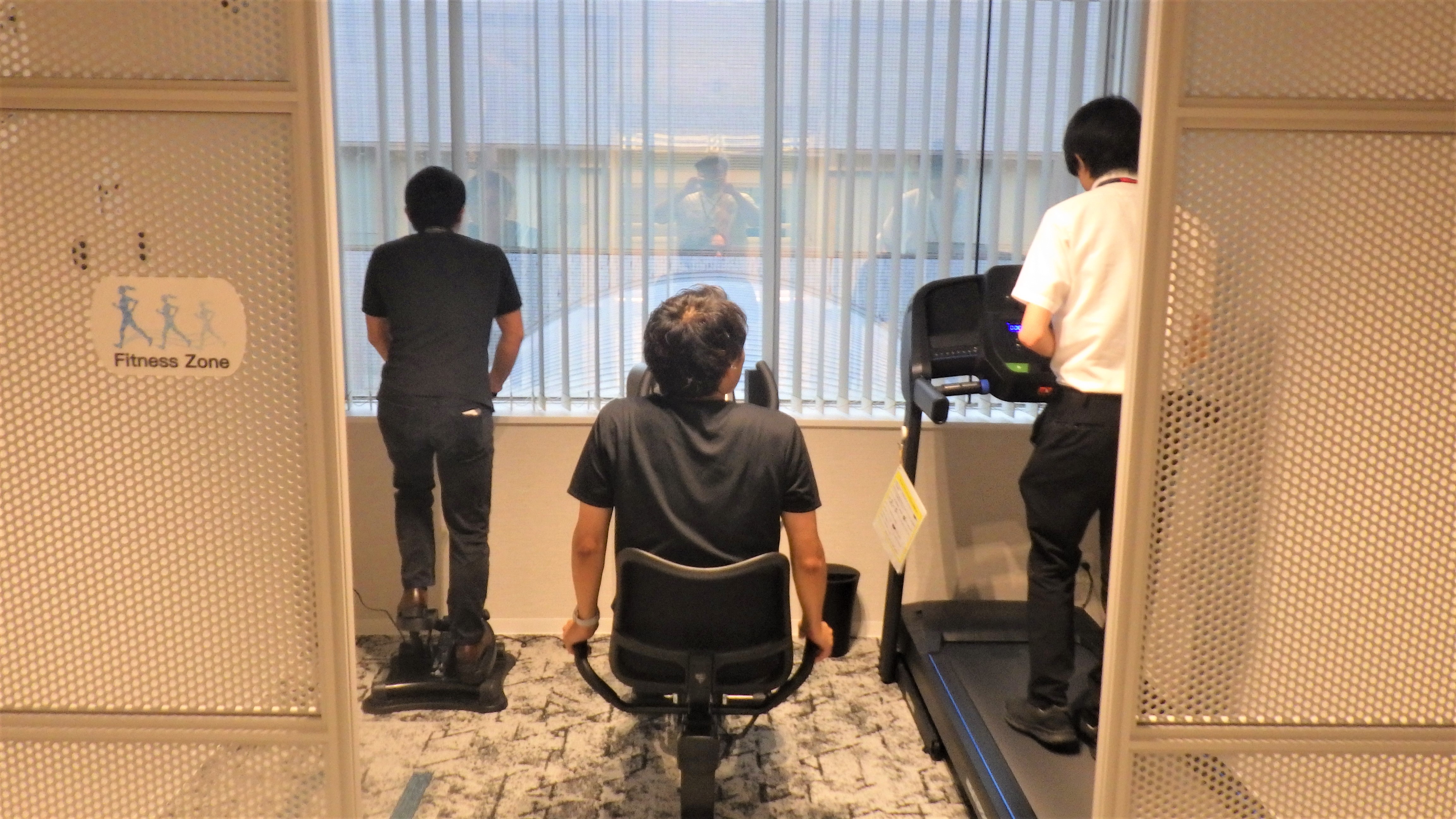 まずは、気軽に運動を始めてみようということで、本社社内に、フィットネスゾーンを設置。運動器具での運動やストレッチができるスペースとなっています。