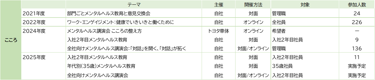 また、メンタルヘルス専門医による管理職向け研修(年1回)、管理職新任研修、新入社員教育など階層別に研修を受けられるようにしています。